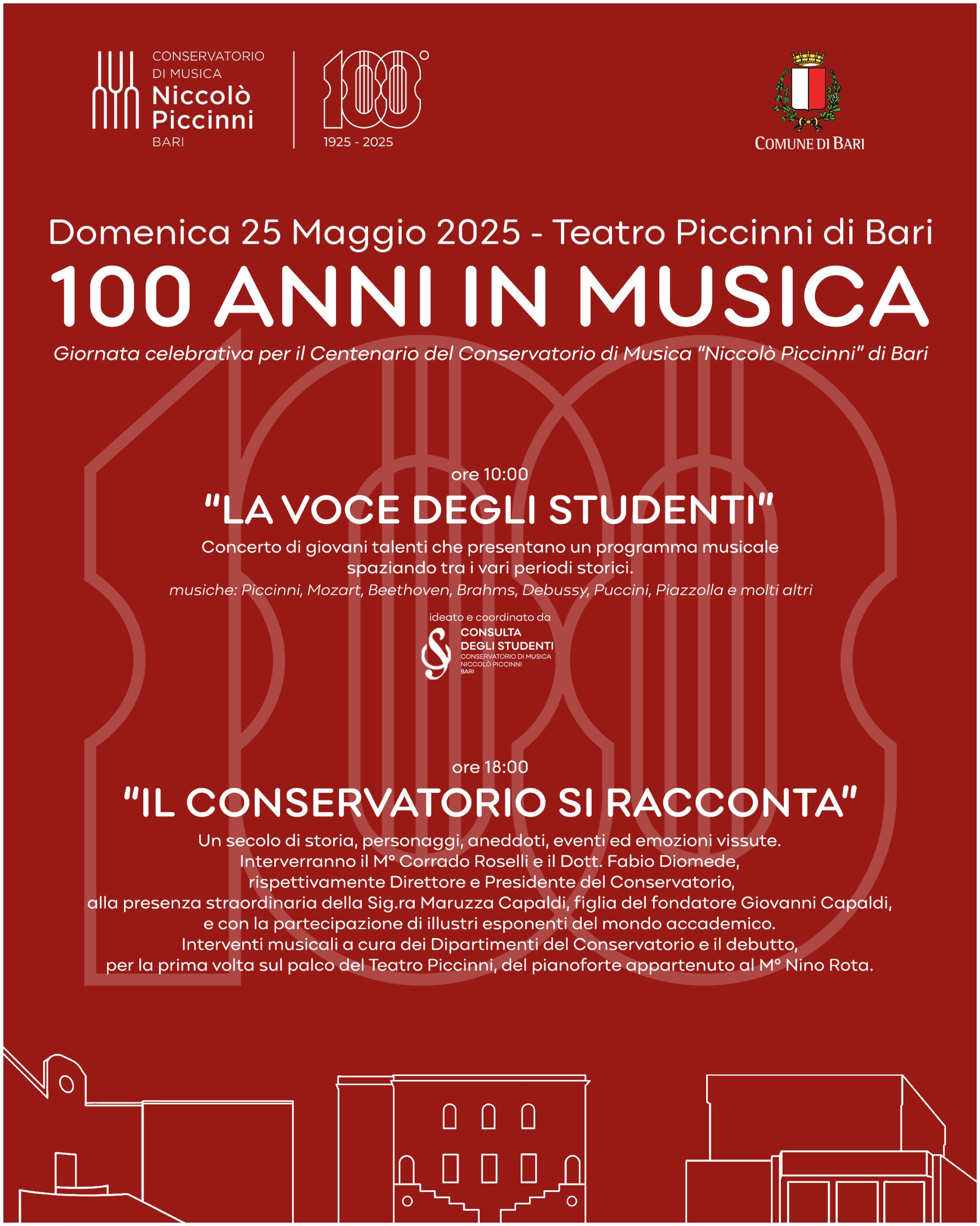 Com’è noto il Conservatorio di Musica "Niccolò Piccinni" di Bari nel 2025, e precisamente il 14 maggio, ha compiuto 100 anni pertanto festeggiando il Centenario.