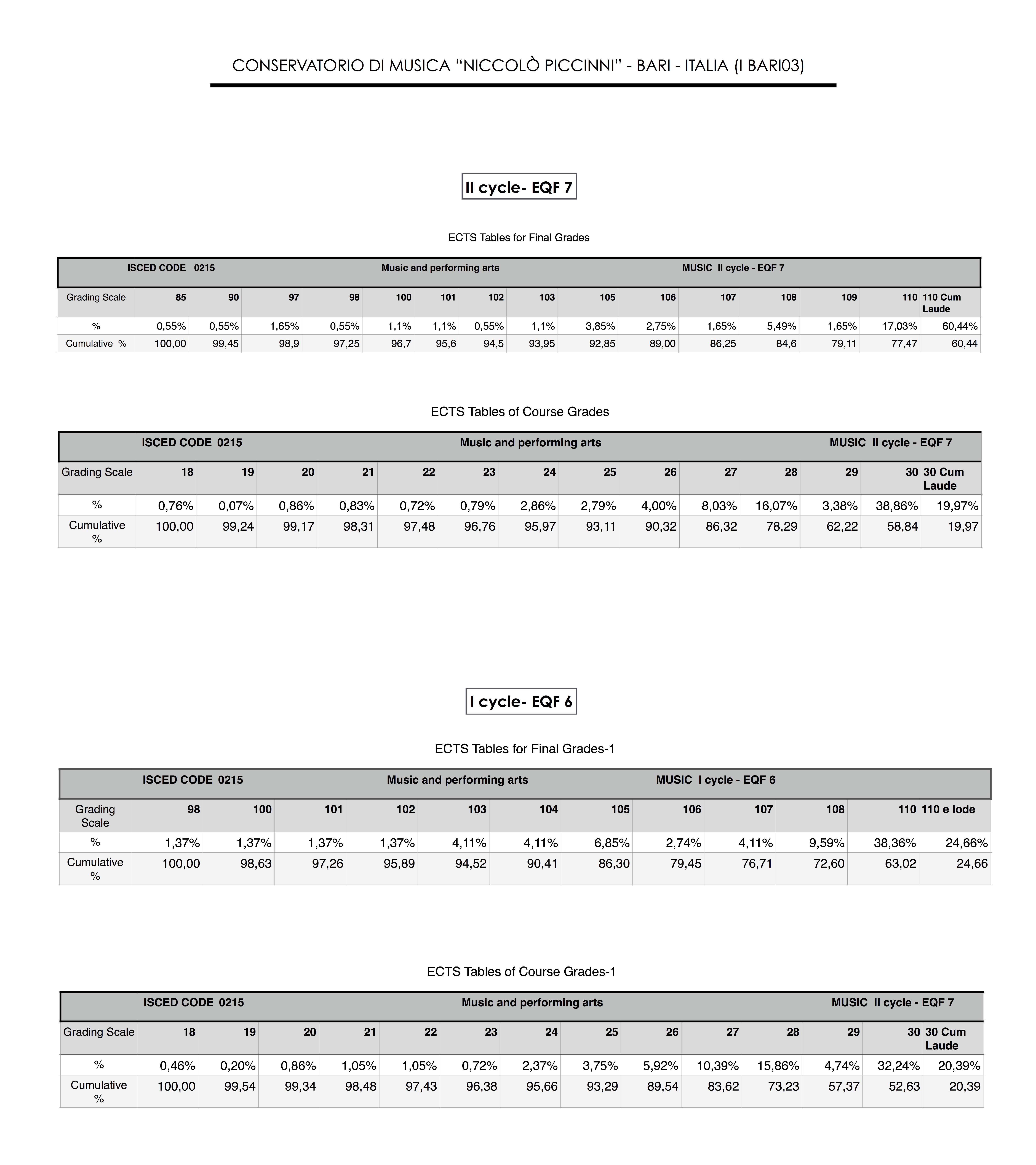 Queste Tabelle quindi, mostrano come il sistema di votazione nazionale viene attualmente usato nel Conservatorio “Niccolò Piccinni” e permette il raffronto con la distribuzione statistica dei voti in altre Istituzioni di Alta Formazione Musicale, italiana o europea.